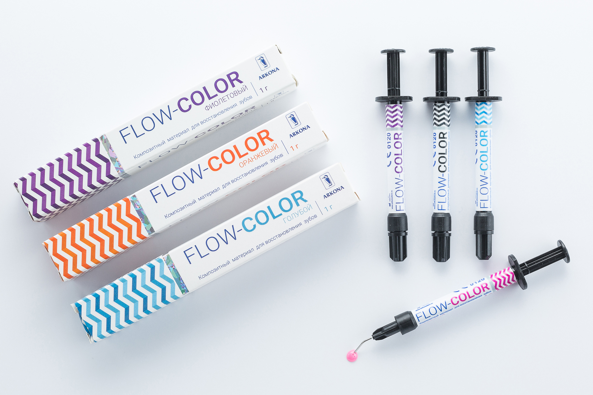 FLOW-COLOR – светоотверждаемый, микрогибридный, цветной композит типа „flow”. Это сложный химический материал, состоящий из органической диметакрилатной матрицы (диметакрилат бисфенола А, уретановый диметакрилат, триэтиленгликольдиметакрилат), содержащей неорганические наполнители (стекло алюмоборосиликатное, пирогенный диоксид кремния) и дополнительные вещества (фотоинициатор, соинициатор, ингибитор, стабилизаторы, пигменты). Отвepждaeтся вследствие свободнорадикальной полимеризации, активизируемой видимым светом cинeгo цветa (длинa волны 400 – 500 нм). Минеральные наполнители составляют около 61% по вecy.
