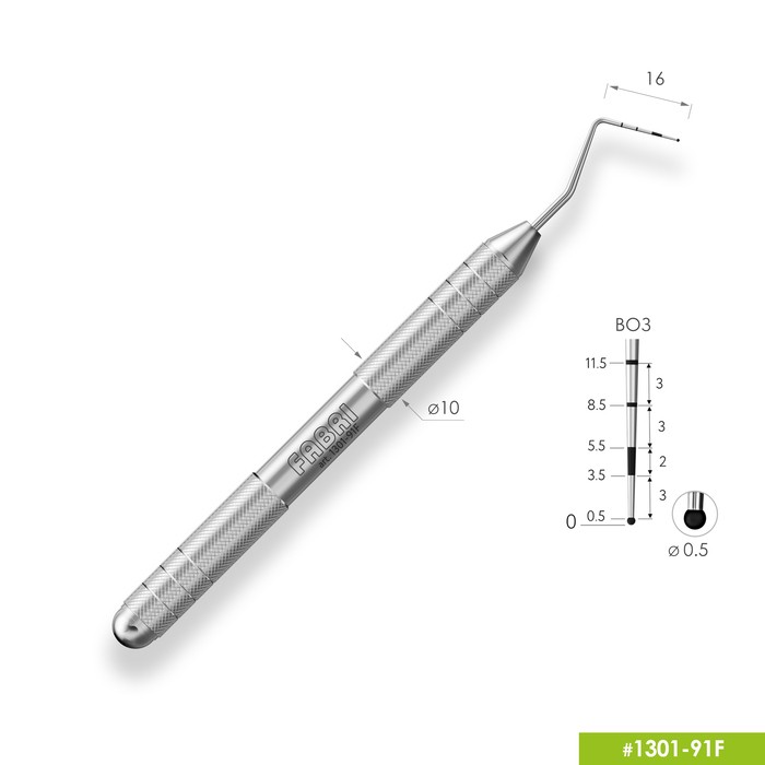 Односторонний пародонтологический мерный зонд для проверки наличия и определения глубины пародонтальных карманов, уровня рецессии десны, степени обнажения корней. Шкала UNC-15 (University of