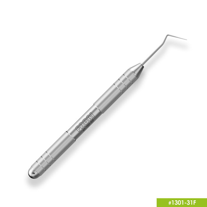Односторонний двухугловой зонд предназначен для обследования глубоких кариозных полостей, устьевой части корневых каналов зуба и фиссур, а так же поиска микротрещин. Может использоваться на боковых и фронтальных поверхностях зубов. Двухугловой изгиб рабочей части облегчает манипуляции в труднодоступных участках ротовой полости